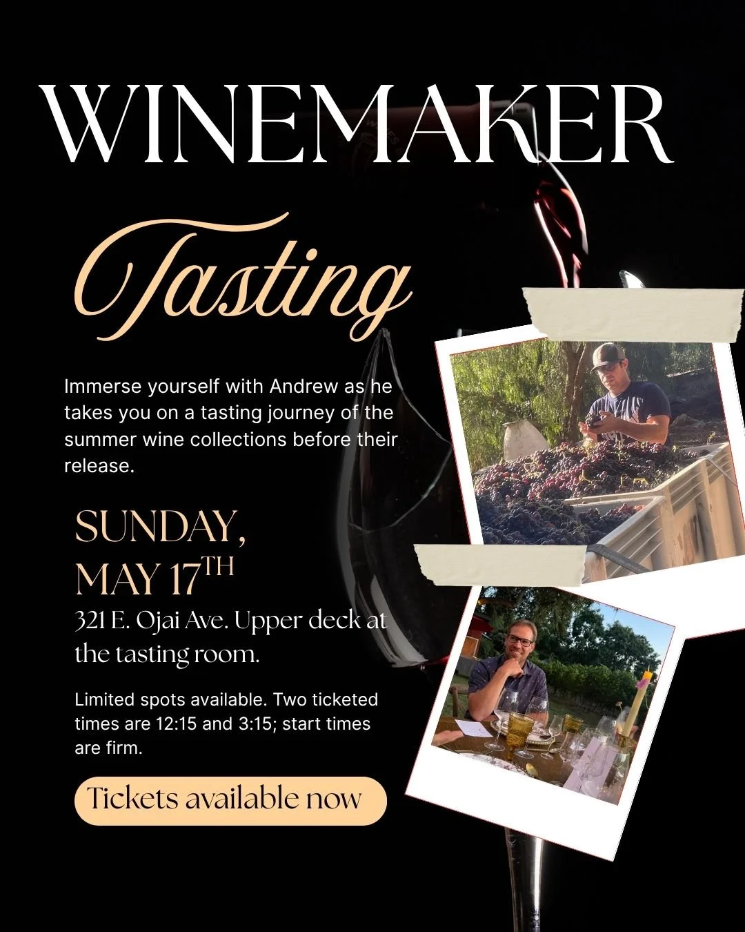 Wine Club members, we invite you to join our Winemaker, Andrew, for an exclusive tasting of our newest wines. This is a special opportunity to experience these selections before they are released in the tasting room next weekend.